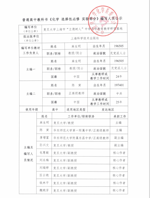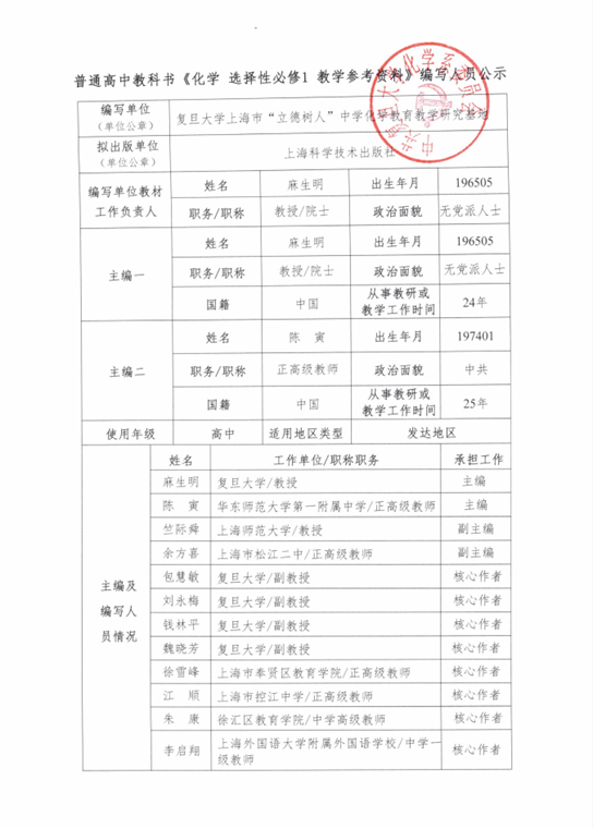 普通高中教科书《化学 选择性必修1 教学参考资料》、《化学 选择性必修 实验部分》编写人员公示