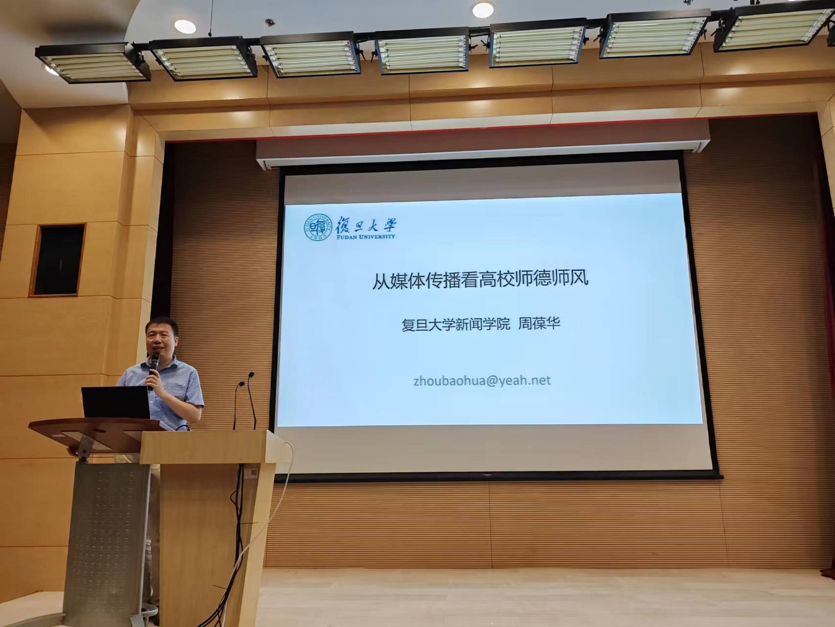 为深入开展学习贯彻习近平新时代中国特色社会主义思想主题教育,不断提升教师思想政治素质和师德素养,6月19日下午,成人直播 在江湾校区先进材料实验室一楼报告厅举行主题教育专题学习暨2023年师德师风专题教育动员会。本次主题教育专题学习,特邀新闻学院副院长周葆华教授作题为“从媒体传播看高校师德师风”的专题报告。成人直播 党委书记马蔚纯同志主持会议并作师德师风专题教育动员。