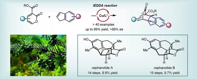 近日,我系蔡泉课题组发展了一种二价铜和手性噁唑啉配体催化的3-酯基-2-吡喃酮与茚的反电子需求全碳DA反应,以一种通用的方法一步对映选择性构建含有多个手性中心和官能团的手性氢化芴结构。在该反应中,茚上的取代基除了给电子基团,还能容忍各种中性甚至吸电子基团,从而极大拓展了反电子需求全碳DA反应亲双烯体的范围,有利于该方法在实际合成中的应用。基于此,他们分别以14步和8.8%的总产率,以及15步和9.7%的总产率实现了三尖杉降二萜天然产物cephanolide A和cephanolide B的不对称全合成。值得指出的是,这是到目前为止这类天然产物分子最简短和高效的不对称合成路线。