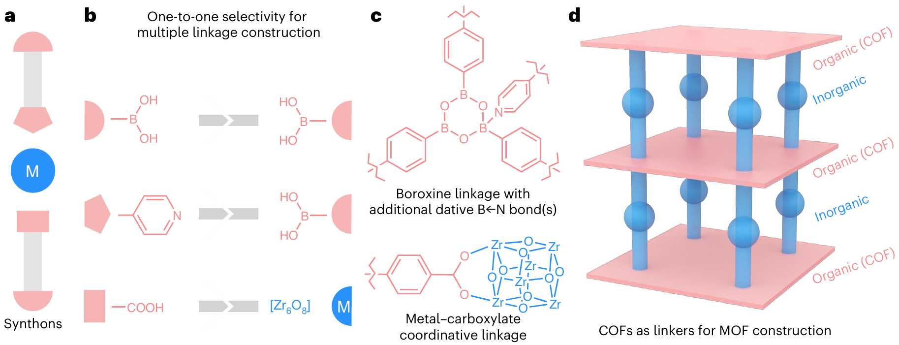 20年来迅速发展的共价有机框架(COF)实现了有机单元的无限且精准的排列。因此从理论上讲,将COF作为子网格引入MOF材料的设想是完全可行的。将上述想法实现,我们需要直面此类框架合成的多重挑战:COF本身无法溶解,且通常缺乏能与金属离子发生配位作用的结合基团。一锅法直接合成虽能规避溶解性问题,但仍需精心设计具有高度空间匹配性与化学反应一对一选择性的多种合成子。此外,只有对共价键合(linkage)与配位键合进行精细调控,确保多个键合反应的同步性和可逆性,才能获得具有单晶特性的结构。