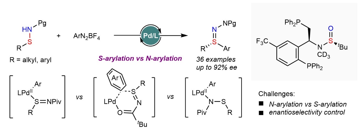 硫手性化合物广泛存在于天然产物及药物分子中,在含有硫立体中心的化合物中,亚砜是最受欢迎和研究最广泛的结构之一。相比之下,它们的氮类似物,硫亚胺,尽管在药物和有机化学中作为临床药物候选者、手性配体和N-自由基前体具有独特的生物和化学性质,受到了越来越多的关注,但却得到了较少的研究。不对称合成硫亚胺,特别是二芳基硫亚胺,仍然是一个具有挑战性且持续的目标,为此,成人直播 张俊良、杨俊锋课题组开发了一种新型的合成硫亚胺的策略,即通过过渡金属钯与Sadphos配体结合催化来实现次磺酰胺的不对称芳基化从而构建硫亚胺。对于该反应,在配体筛选中发现部分商业配体均未能得到产物,而Sadphos系列配体可以良好的产率及对映选择性得到最终产物,展现了Sadphos强大的催化效果。在底物拓展部分,针对芳基次磺酰胺可以很好的兼容邻间对及给电子、吸电子底物,芳基重氮给电子底物反应效果也较好。此外,多取代、烷基以及杂环的次磺酰胺也能顺利反应。在随后的克级规模制备中可维持产率和对映选择性。在衍生转化中可在构型保持的条件下得到多种六价砜亚胺,证明了其广泛的应用前景。在机理探究中,通过动力学实验和DFT计算证明重氮的氧化加成为速率控制步骤。