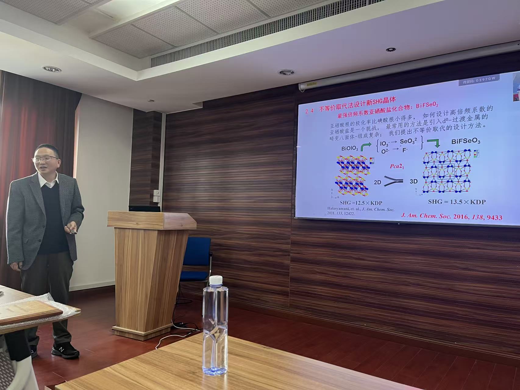 毛江高研究员分享了课题组在新型无机倍频晶体的设计与合成的研究成果,深入浅出地介绍了非线性光学晶体及其在激光和光学器件等领域的重要应用,重点介绍近年来金属碘酸盐、磷酸盐、硼酸盐、亚硒酸盐等新型无机倍频晶体的设计与合成研究进展。并详细讲解了在设计合成非中心对称结构的晶体以及高性能倍频晶体过程中的一些策略和经验,例如采用不等价取代、碘酸根离子的聚合以及机器学习等等。