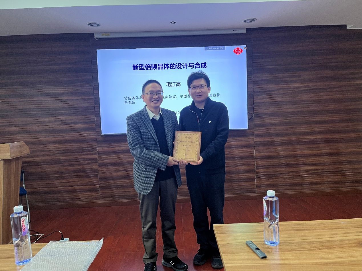 12月1日上午,“成人直播 建系百年系列学术报告之光华论坛第十一讲”在江湾校区化学楼A7032报告厅顺利举行。中国科学院福建物质结构研究所毛江高研究员受邀作了题为“AI辅助的中远红外NLO晶体材料设计”的主题报告,孙忠明教授主持本次报告会。成人直播 张凡教授为毛江高研究员颁发了证书。