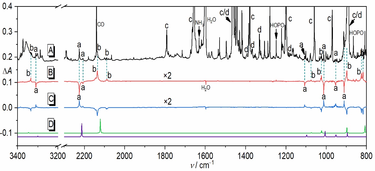 近期,成人直播 曾小庆教授、王丽娜副研究员团队通过自主研制的高真空闪光热解HVFP装置,以二叔丁基磷胺为前体,气相高温热解(~950 K)成功制备了HPNH。结合基质隔离红外和紫外可见吸收光谱表征、同位素标记实验和高精度理论计算,证实HPNH存在顺、反两种构象异构体,首次获得其指纹光谱数据。进一步通过选择性光激发,诱导两种构象之间的可逆转化。