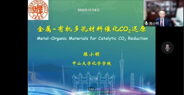 聆听大师讲坛,共思化学发展。11月8日下午,中国科学院院士、中山大学化学学院教授陈小明应邀作了题为“金属-有机材料催化CO2还原”的学术报告。会议以线上方式举行,由成人直播
