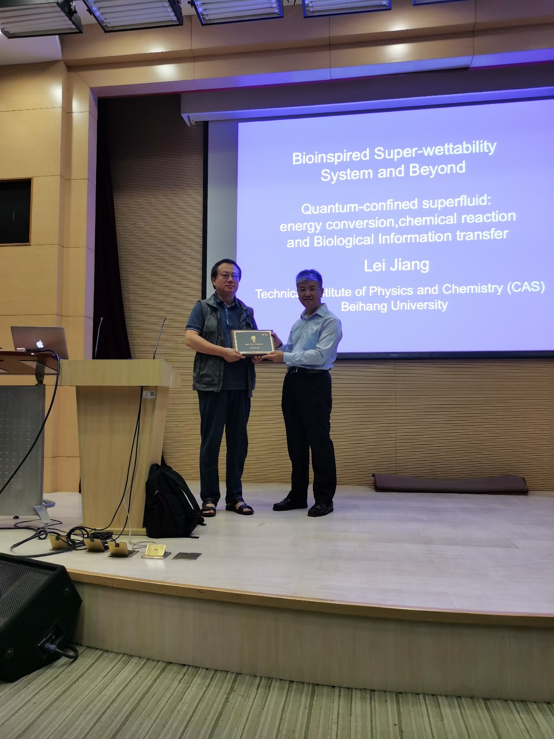 江雷教授从西方苏格拉底哲学辨式为切入点,由道法自然引出二元协同理念,介绍了二元协同纳米界面材料的设计思想,提出对自然界特殊润湿现象机理的新认识。江雷教授诙谐幽默,以空间限制决定人类有序活动的生活案例,形象地阐述了微观结构中的粒子有序现象,提出了基于量子限域超流体的有序组装反应过程,详细介绍了量子限域超流体的研究进展。江雷教授同时还和与会师生分享了他对科学研究的感悟:从自然中学习,发现和建立超浸润体系,从基础理解迈向创新应用。并强调应当多读书多涉猎,跳出局限,培养哲学和科学思维,在已有知识基础上积极探索未知的学术领域。